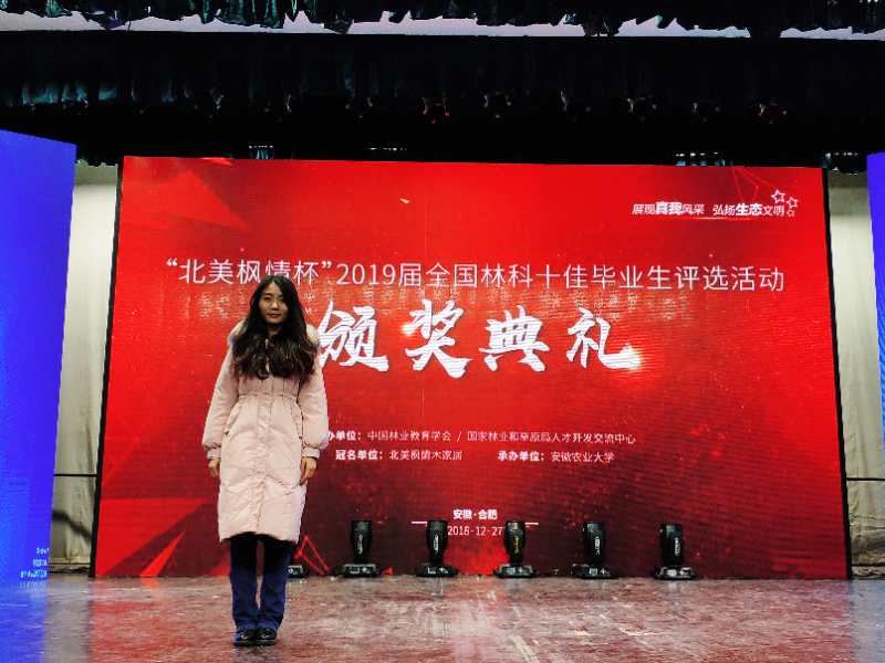 【核心提示】12月27日下午两点半,以“展现真我风采,弘扬生态文明”为主题的“北美枫情杯”2019届全国林科十佳毕业生颁奖典礼在安徽农业大学大礼堂举行,kaiyun开云官方网站辅导员李永煕老师带领kaiyun开云官网获奖学生——园林1503班袁月赴现场参与活动。