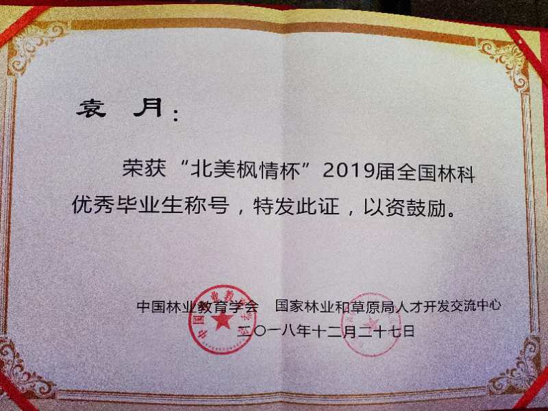 本届全国林科优秀毕业生获奖学生——园林1503班袁月同学谦虚地说到:“能够顺利获奖,是得益于母校的平台优势与老师同学们的关心和帮助,相信每个人都能通过挥洒汗水,收获自己理想的果实,即使遇到困难也绝不应该放弃,只要一直努力一直努力,总会穿过迷雾,看到曙光”。