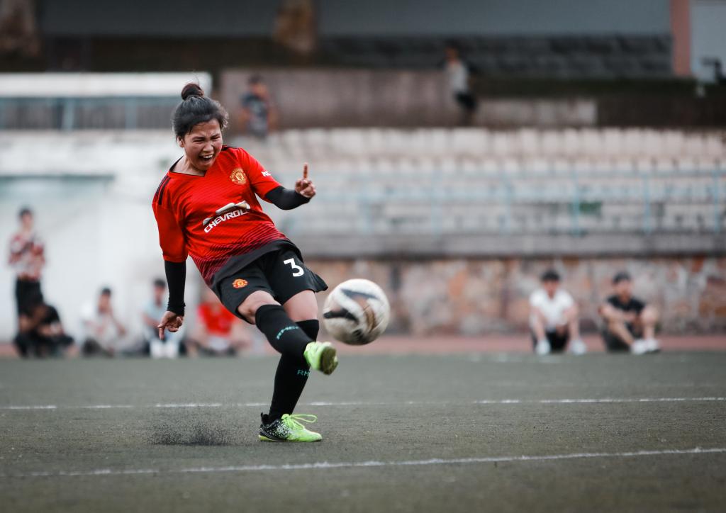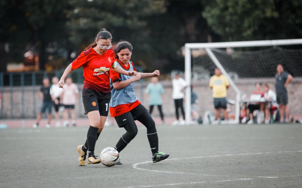 晚六点,球队队员陆续到达第一运动场,队长黄静一边带领队员们进行热身,一边安排战术。身穿红色队服的女足队员们成为了田径场上一抹绚丽的色彩。