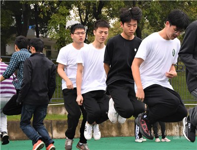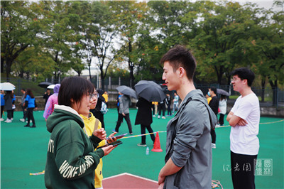 集合完毕后,运动员在细雨中进行试跳。校党委书记高翅身着雨衣,亲临现场进行指导。在不断的磨合中,运动员逐渐找到节奏,配合越发娴熟。他们互相加油鼓劲,一起大声喊出:“园林,加油!”