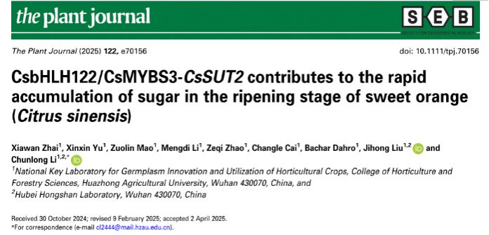 近日,kaiyun开云官方网站刘继红/李春龙团队在The Plant Journal在线发表了题为“CsbHLH122/CsMYBS3-CsSUT2 contributes to the rapid accumulation of sugar in the ripening stage of sweet orange (Citrus sinensis)”的研究论文。研究证明柑橘糖转运蛋白CsSUT2具有蔗糖转运功能,并通过遗传转化和分子生物学技术揭示了CsbHLH122/CsMYBS3-CsSUT2模块如何在果实成熟阶段促进糖分积累的分子机制。