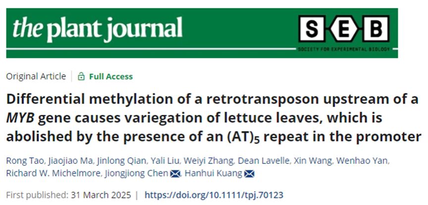 2025年3月31日,kaiyun开云官方网站果蔬园艺作物种质创新与利用全国重点实验室和湖北省洪山实验室匡汉晖教授团队在《the plant journal》发表了题为“Differential methylation of a retrotransposon upstream of a MYB gene causes variegation of lettuce leaves, which is abolished by the presence of an (AT)5 repeat in the promoter”的研究论文。该研究揭示了生菜MYB转录因子启动子区域的DNA甲基化差异导致叶片红色斑点形成的分子机制,并发现启动子区域存在特定长度的简单重复序列时,叶片会呈现均匀的红色表型。