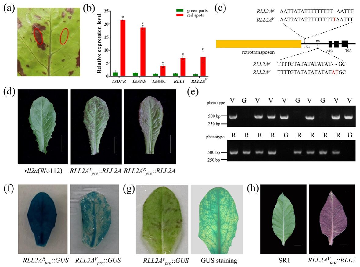 研究团队通过构建双亲分离群体,并结合Bulked Segregant Analysis(BSA)和RNA-seq(BSR-Seq)技术,成功鉴定了调控生菜叶片红色斑点表型的位点。研究发现,两个位点调控生菜红色斑点的有无表型。针对这两个位点,研究团队分别构建了分离群体,并通过精细定位和基因克隆,确定了两个关键基因:LsANS和编码MYB转录因子的RLL2AV。其中,LsANS基因的功能缺失会导致花青素合成途径受阻,从而引起红色斑点消失,但该基因并不直接参与斑点形成的调控。而转录组分析结果显示RLL2AV基因在红色斑点区域特异性表达,在绿色区域不表达。这种表达模式与RLL2AV基因-761 bp位置插入的反转录转座子的甲基化水平密切相关:在红色斑点区域该反转录转座子的甲基化水平较低,而绿色区域则表现出较高的甲基化水平。进一步遗传分析表明,当RLL2A启动子-409 bp处存在(AT)5重复序列时,RLL2A基因稳定表达,从而使叶片呈现均匀的红色表型。本研究发现了生菜中通过MYB基因启动子区域甲基化水平差异调控红色斑点形成的分子机制,同时证明了特定长度的简单重复序列对基因表达的稳定性具有重要调控作用。