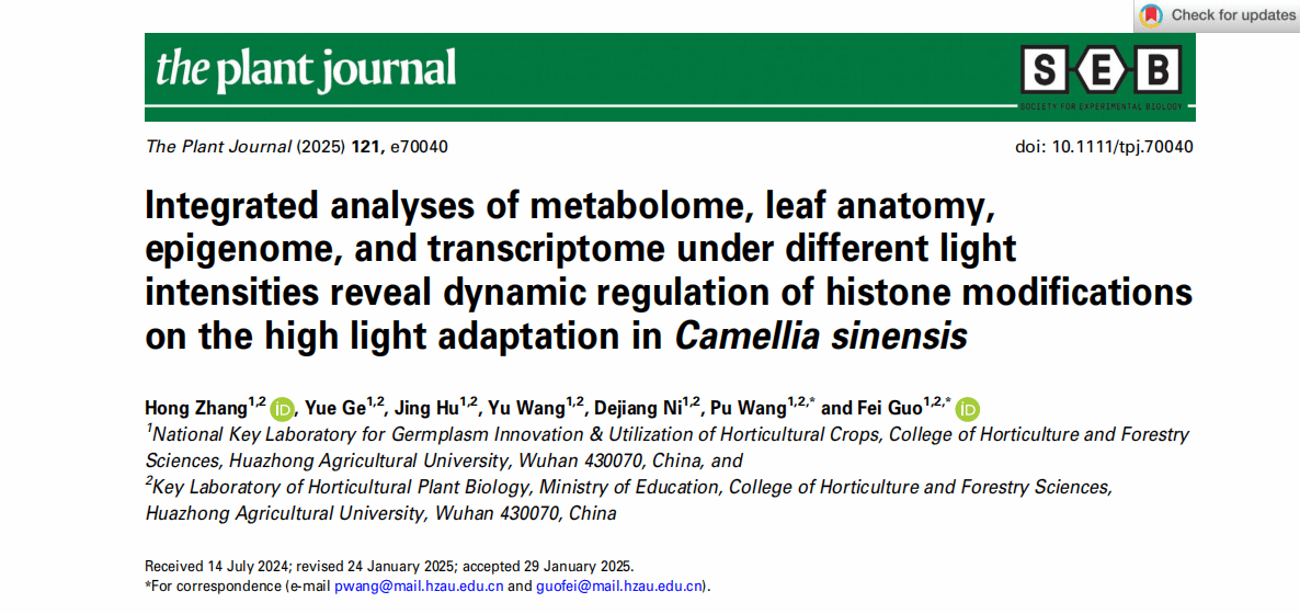近日,kaiyun开云官方网站茶树种质资源与遗传育种团队在The Plant Journal上在线发表了题为“Integrated analyses of metabolome, leaf anatomy, epigenome, and transcriptome under different light intensities reveal dynamic regulation of histone modifications on the high light adaptation in Camellia sinensis”的研究论文。本研究整合代谢组、叶片解剖结构、表观基因组和转录组进行多维度分析,揭示了组蛋白修饰在茶树高光适应中的动态调控作用。