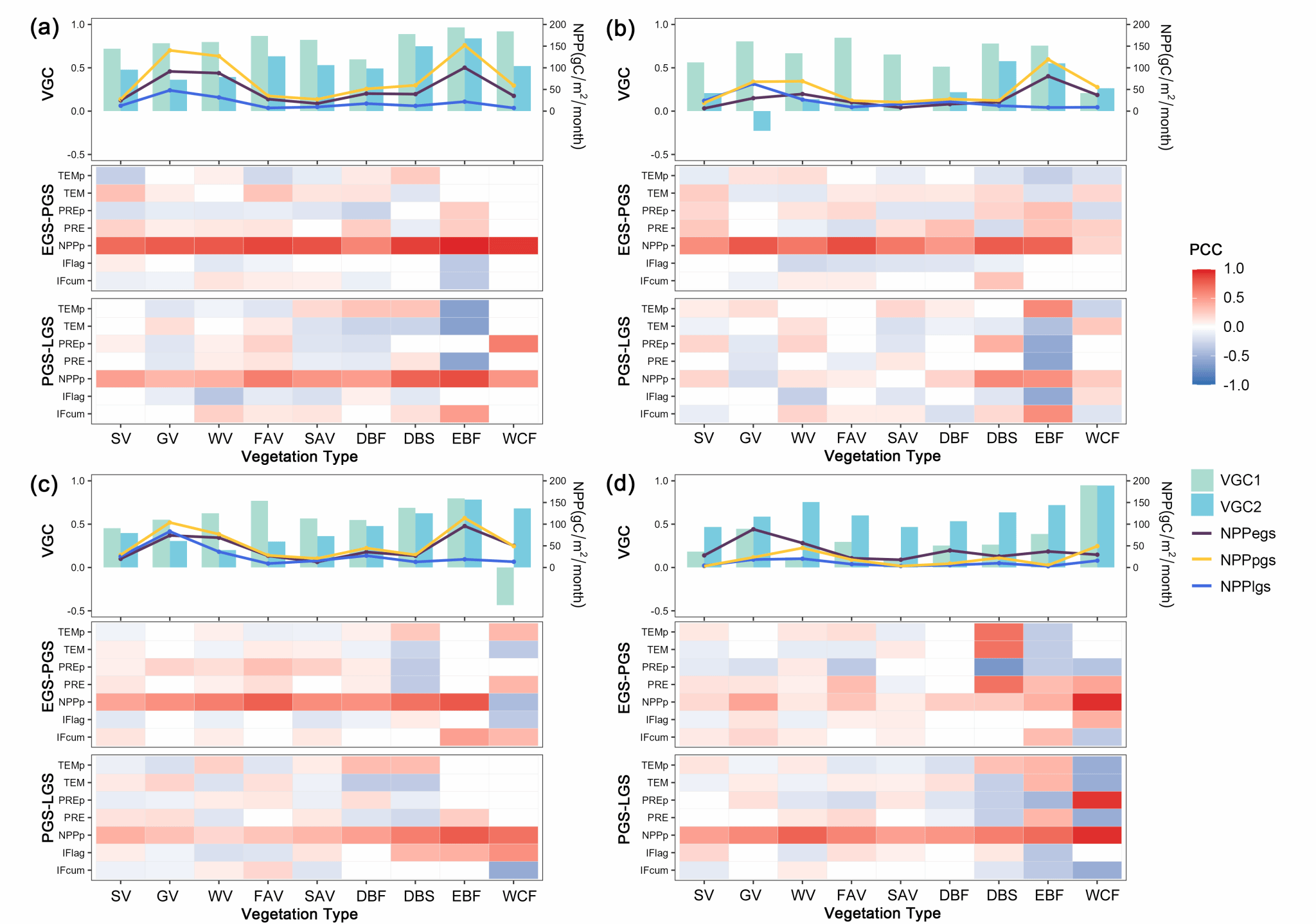 图6 不同极端水文情景下各类湿地植被的季节尺度NPP和VGC。包括:(a) 常规洪水情景(2017年); (b) 先旱后洪情景(2016年);