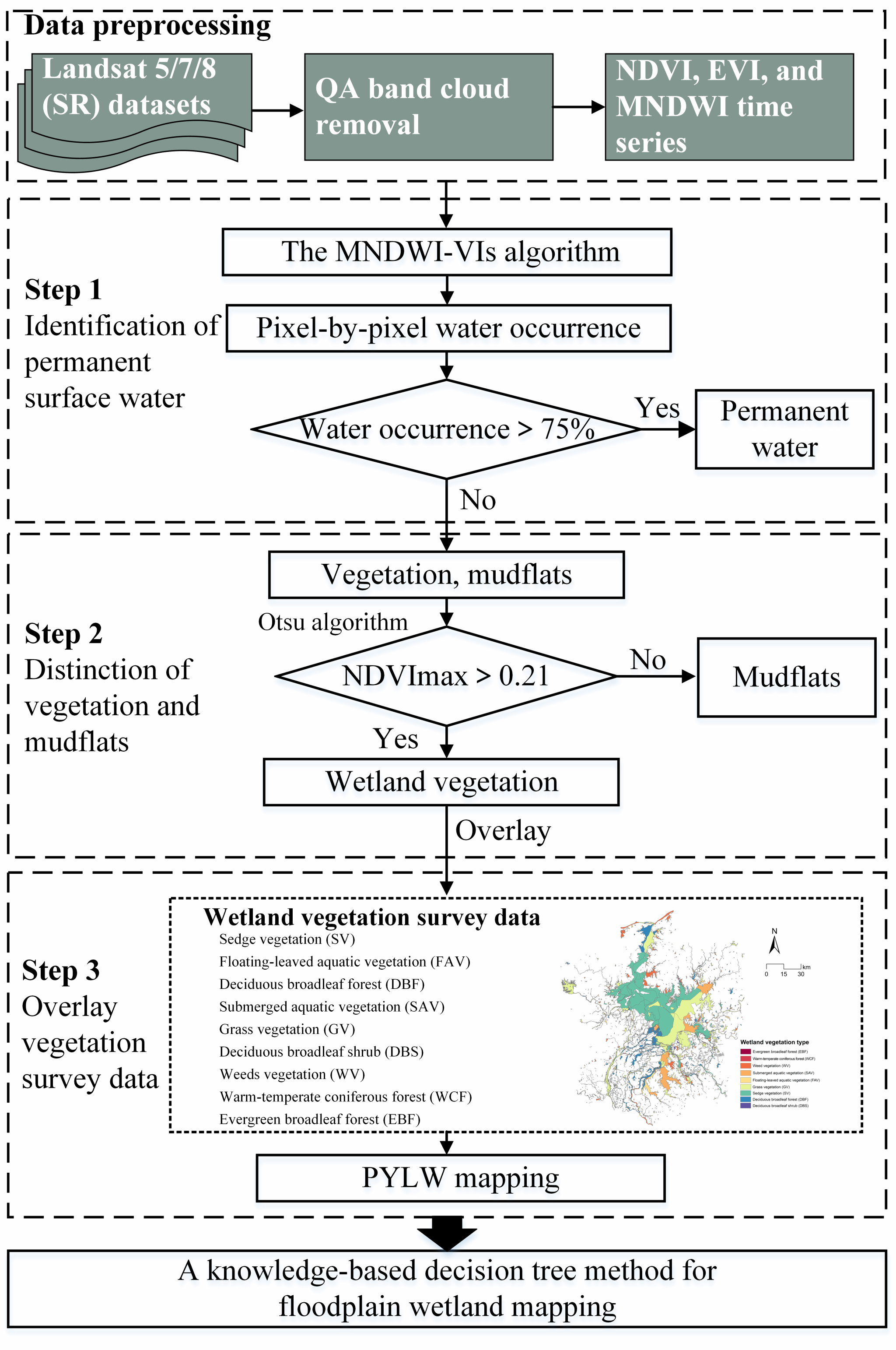 第一,结合基于知识的决策树模型和湿地植被调查数据,提出适用于季节性动态景观的湿地制图流程,以应对复杂的年内洪水脉冲动态给洪泛湿地制图带来的挑战。
