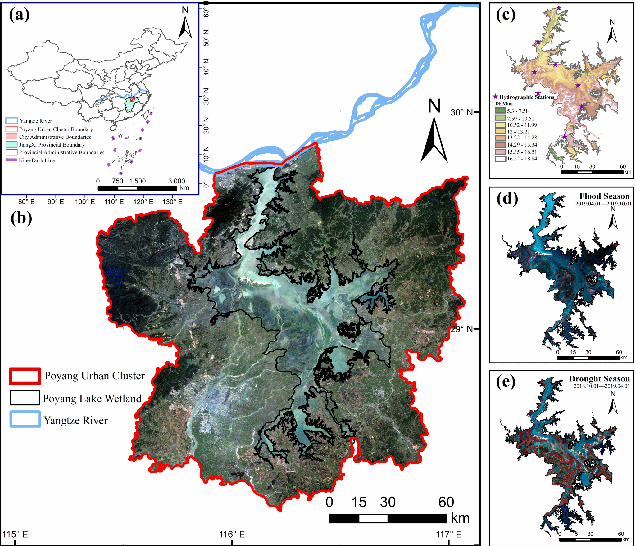 图2 鄱阳湖湿地(a)区位图,(b)真彩色影像,(c)数字高程模型,(d) 丰水季假彩色影像和 (e) 枯水季假彩色影像