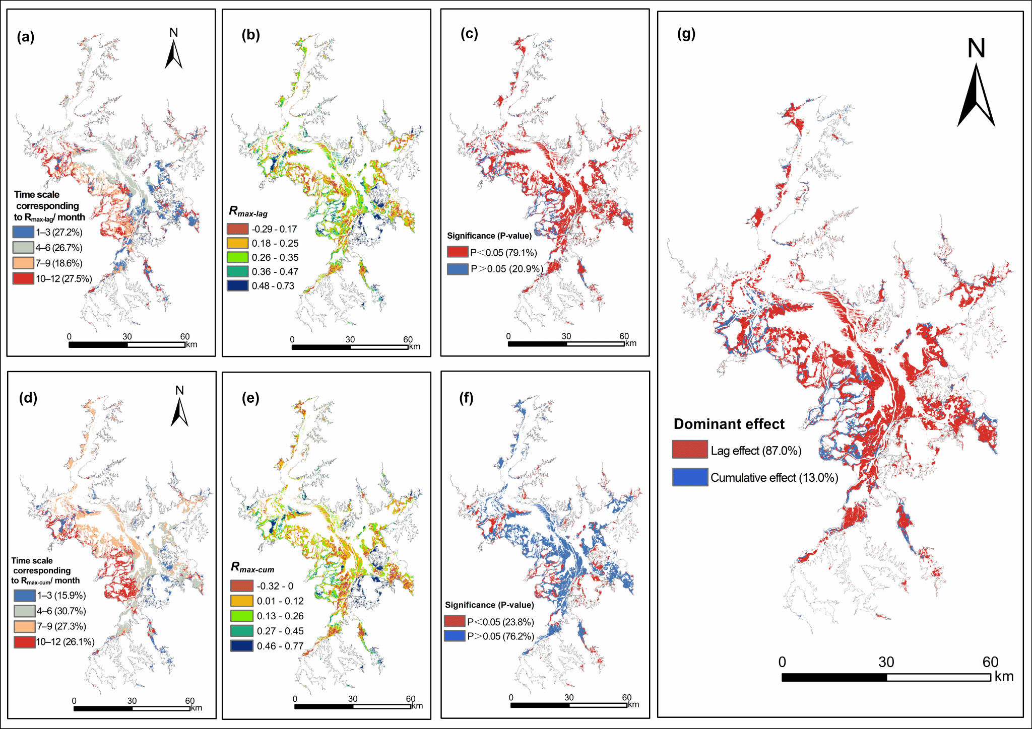 图 4 水文变率对鄱阳湖湿地植被生长的滞后效应和累积效应。包括:(a) 最大相关滞后期(月份);(b) 最大滞后相关系数(Rmax-lag);(c) 滞后效应的显著性检验;(d) 最大相关累积期(月份);(e) 最大累积相关系数(Rmax-cum);(f) 累积效应的显著性检验;(g) 主导效应