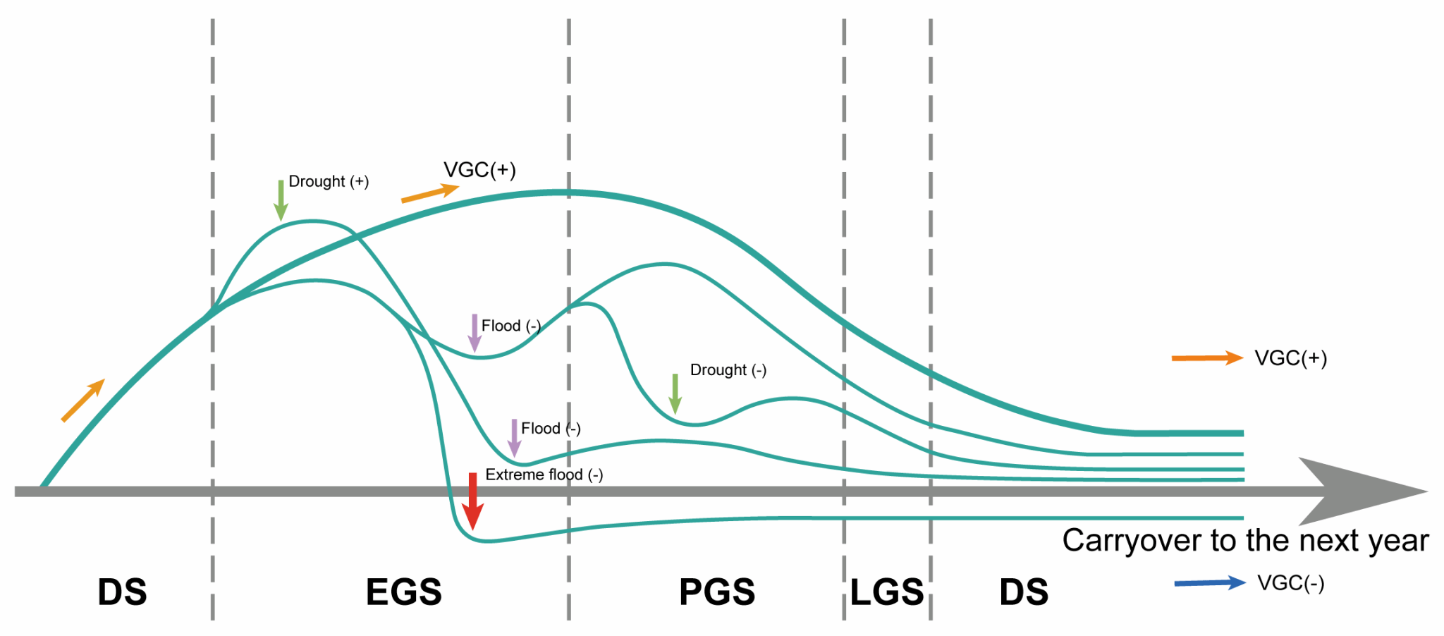 第四, 由于在植被碳吸收过程中非结构性碳水化合物 (NSCs) 和结构性碳水化合物 (SCs) 的功能差异,上一季的生物量残留可以通过 NSCs 的储存和动员来帮助湿地植被抵御当季的不利条件。研究提出使用多季节植被生长转结效应以评估洪泛平原湿地对多种极端水文情景的脆弱性,突破了传统“植被绿度即生态健康”的单一认知。