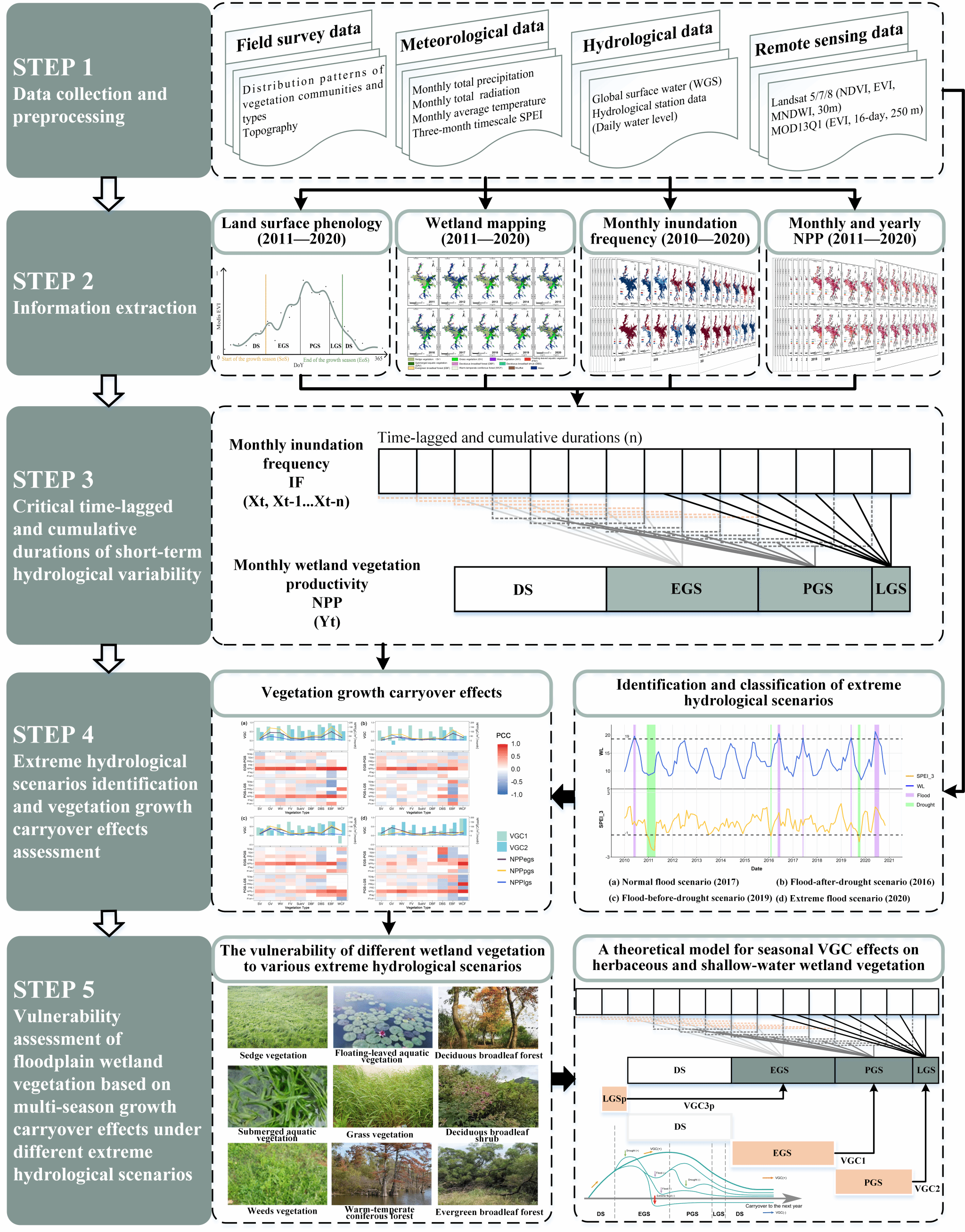 尽管湿地植被具备特定的生理和生态特征,能够适应湿润和干燥环境的交替变化,但随着水文动态复杂性的增加,其适应能力可能不足以应对,从而导致湿地的退化。目前仍不明确洪泛湿地如何响应这些水文动态。该研究以中国江西省鄱阳湖湿地为例,提出通过湿地植被生长过程中的内源和外源记忆以理解洪泛平原湿地生态系统对多时间尺度水文动态的响应机制,并取得以下主要成果: