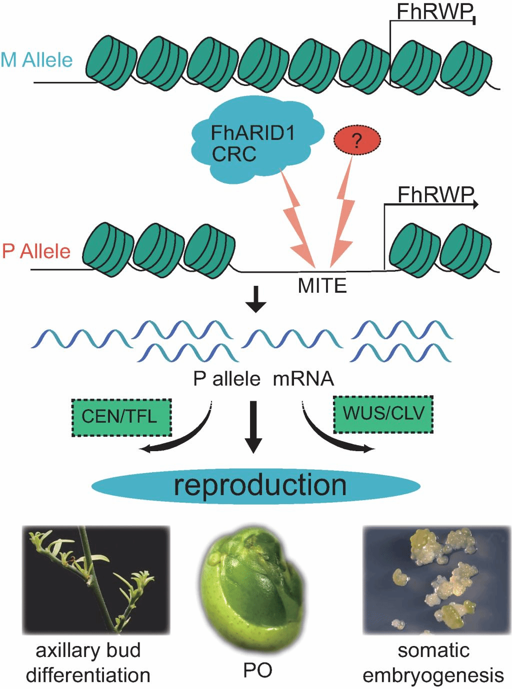 柑橘是研究珠心胚的模式植物,正向遗传学鉴定柑橘属和金柑属中由单一显性基因RWP控制,但其调控机制尚未完全解析。本研究以短童期山金柑(Fortunella hindsii)为研究对象,探究了珠心胚形成过程中染色质的可及性,发现参与再生/细胞命运转变的基因在多胚(无融合生殖类型)山金柑中相较于单胚(有性生殖类型)表现出更高的开放程度。此外,在多胚山金柑FhRWP启动子的MITE转座子区域中观察到更高的染色质可及性水平,且具有链特异性。RNAi和CRISPR-Cas9基因编辑实验表明,下调FhRWP表达水平导致珠心胚数量发生降低,而敲除FhRWP可导致腋芽部位发育异常,花分化能力几乎丧失。单胚柑橘品种本身难以诱导获得胚性愈伤组织,本研究发现FhRWP过表达具有诱导单胚山金柑茎段产生胚性愈伤组织的能力,表明FhRWP具有促进细胞命运向胚性转变的能力。