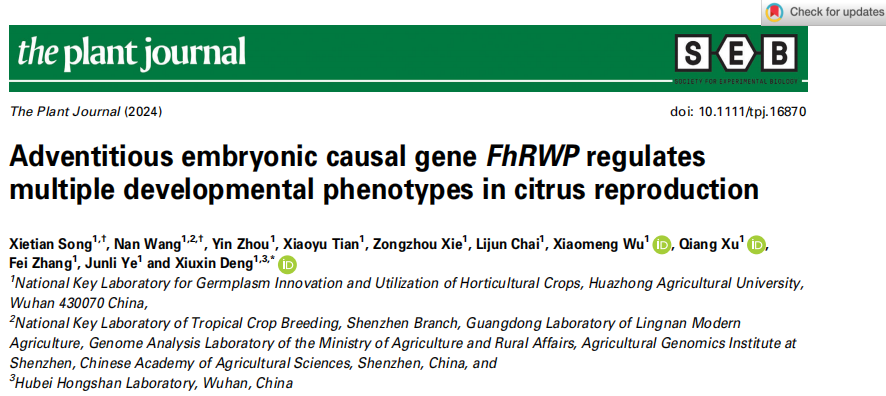 kaiyun开云官方网站邓秀新院士为该论文的通讯作者,博士生宋谢天和已毕业博士王楠(现中国农业科学院农业基因组研究所博士后)为该论文的共同第一作者。kaiyun开云官方网站叶俊丽副研究员、柴利军教授为该研究提供了重要指导,kaiyun开云官方网站博士生周银、田啸宇、kaiyun开云官方网站徐强教授、张飞教授、伍小萌教授和谢宗周高级工程师也参与了本研究工作。该研究在国家重点研发计划(2022YFF1003100)、国家现代农业(柑橘)技术体系(No. CARS-26)等项目的资助下完成。