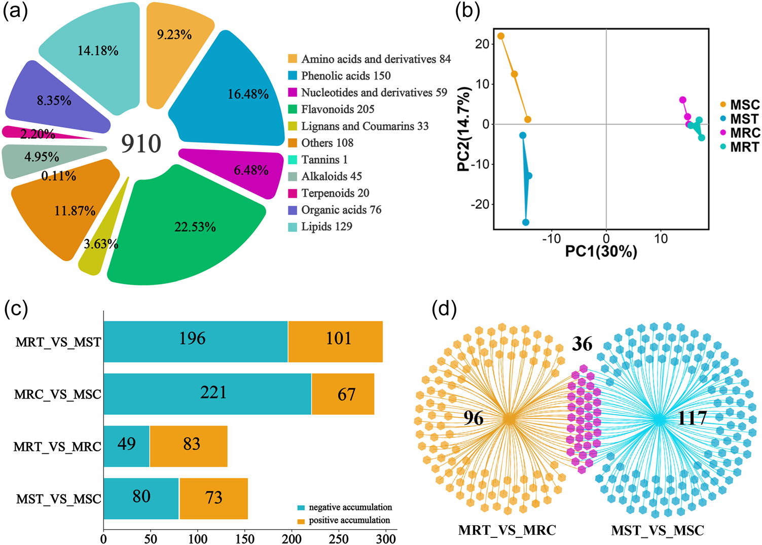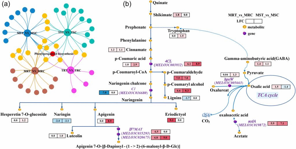 随后研究人员通过代谢组分析对所检测到的910种代谢物进行了分类、差异鉴定及富集分析,其中黄酮类物质占比最多,并且蔓枯病病原菌的侵染导致Payzawat和PI511890中类黄酮的种类和含量发生了显著变化,而金圣草黄素及其衍生物在PI511890中大量积累。此外,有6种差异代谢物在抗感材料中表现出完全相反的积累模式,草酸在PI511890经病原菌侵染后正积累而在Payzawat中负积累,PI511890中正积累的草酸来源于三羧酸循环和乙醛酸循环。研究人员通过全长转录组与代谢组的联合分析,进一步发现转录后调控广泛参与了甜瓜对蔓枯病的防御响应,并推断圣草酚和草酸为甜瓜抗蔓枯病的早期标志性代谢物。综上,该研究揭示了甜瓜在转录与代谢水平上对蔓枯病的早期防御响应,为阐明甜瓜对蔓枯病的抗性机制提供了重要见解和理论依据。