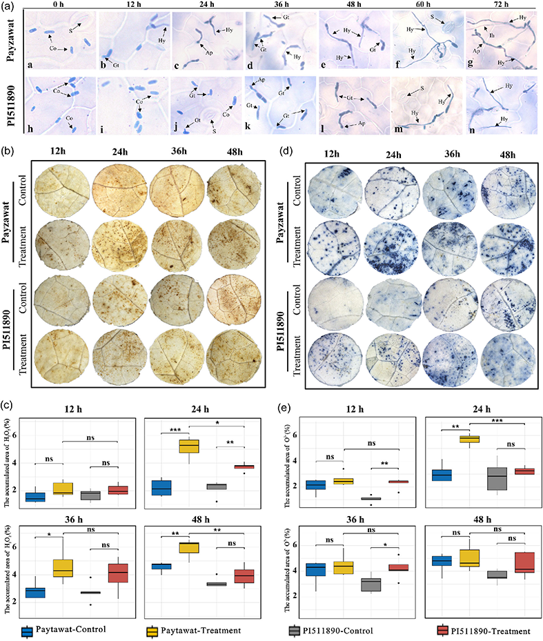 该研究首先通过台盼蓝染色法对蔓枯病病原菌在抗病甜瓜PI511890与感病甜瓜Payzawat叶片上的生长及侵染过程进行观察,在感病材料Payzawat上可以明显观察到病原菌侵染过程的5个阶段:分生孢子萌发、芽管形成与伸长、附着胞形成、菌丝生长与蔓延、菌丝入侵,相比之下,病原菌在抗病材料PI511890的叶片上的生长受到了明显的抑制,在24 hpi才观察到分生孢子萌发。研究人员同时利用DAB与NBT等组织化学染色法对抗感甜瓜叶片上ROS积累量进行了检测与分析,发现所有处理组中的H2O2与O2−积累量均高于其对照组,并且在24 hpi,Payzawat叶片上ROS的积累量显著高于PI511890。实验表明蔓枯病病原菌的入侵促进了甜瓜叶片上活性氧的积累,并且确定24 hpi为Payzawat与PI511890对蔓枯病病原菌的侵染早期作出不同防御响应的关键时间点。