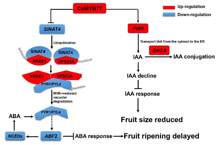 为了解析其中的分子机制,通过DAP-Seq测序和体内外互作实验(LUC,Y1H和EMSA),该研究鉴定到两个受CsMYB77调控的下游靶基因SINAT4与PIN5。进一步,该研究通过瞬时遗传转化山金柑和番茄初步揭示了两个靶基因的功能,在番茄与山金柑里瞬时超表CsSINAT4可显著促进果实成熟;瞬时超表CsPIN5则可显著降低山金柑果实大小。经研究发现,CsMYB77可负调控E3泛素连接酶基因SINAT4的表达,继而SINAT4通过调控FREE1和VPS23A蛋白来间接调控ABA受体蛋白PYR1/PYL4的丰度,进而参与ABA合成及信号转导通路的调控,从而参与调控果实成熟;而PIN5则是被CsMYB77激活上调表达,从而介导降低细胞内free-IAA的含量,通过调控生长素体内平衡及信号转导来调控柑橘果实大小(图1)。
