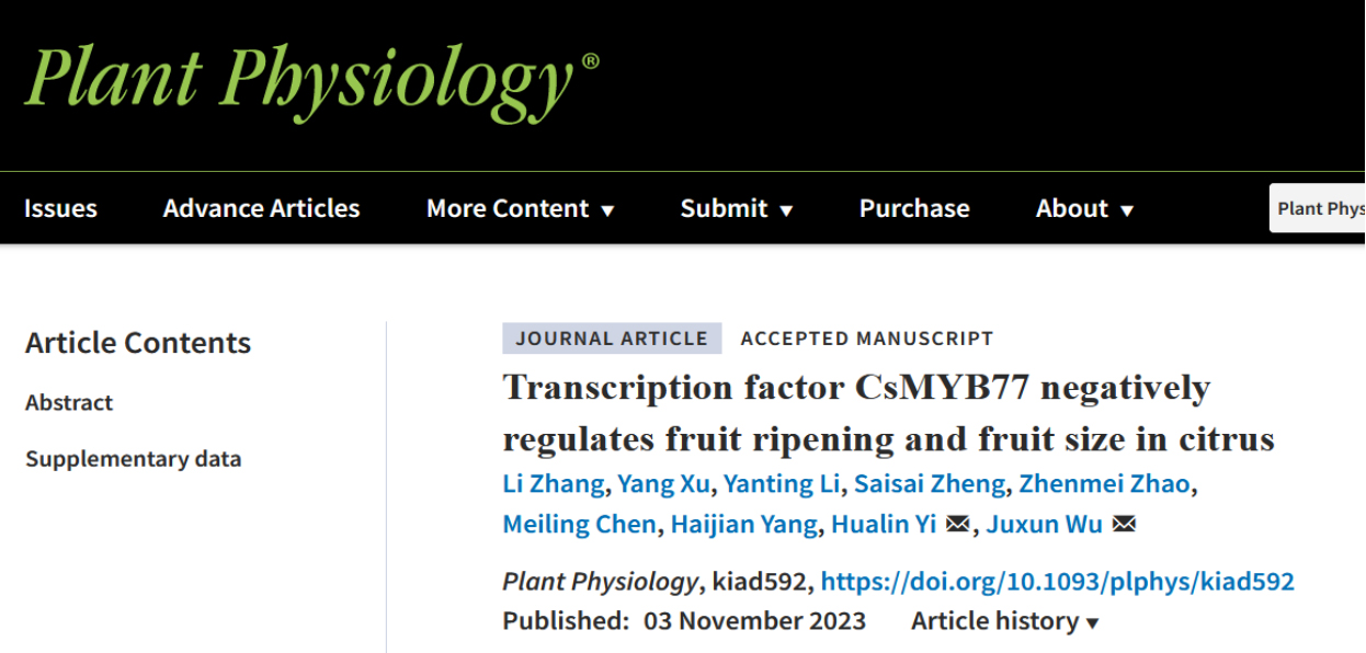 近日,kaiyun开云官方网站果蔬园艺作物种质创新与利用全国重点实验室伊华林/吴巨勋老师课题组在Plant Physiology发表了“Transcription factor CsMYB77 negatively regulates fruit ripening and fruit size in citrus”的研究论文,揭示了转录因子CsMYB77通过调控SINAT4和PIN5分别参与脱落酸(ABA)和生长素信号通路的调控,从而实现负调控柑橘果实成熟和果实大小的分子机制。
