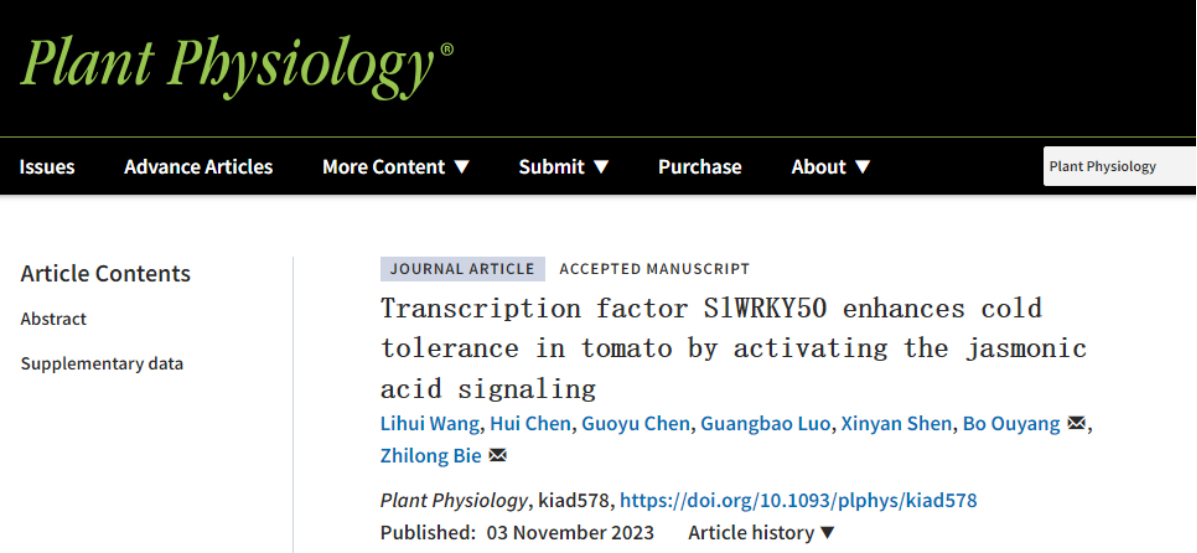 近日,Plant Physiology在线发表了kaiyun开云官方网站、果蔬园艺作物种质创新与利用全国重点实验室别之龙教授团队和欧阳波教授团队合作完成的论文“Transcription factor SlWRKY50 enhances cold tolerance in tomato by activating the jasmonic acid signaling”,解析了转录因子SlWRKY50通过介导茉莉酸信号途径调控番茄低温响应的分子机制,为进一步研究WRKY转录因子的潜在机制和植物低温响应机制奠定了基础,同时也为未来耐低温番茄品种的选育提供了新的基因靶点。