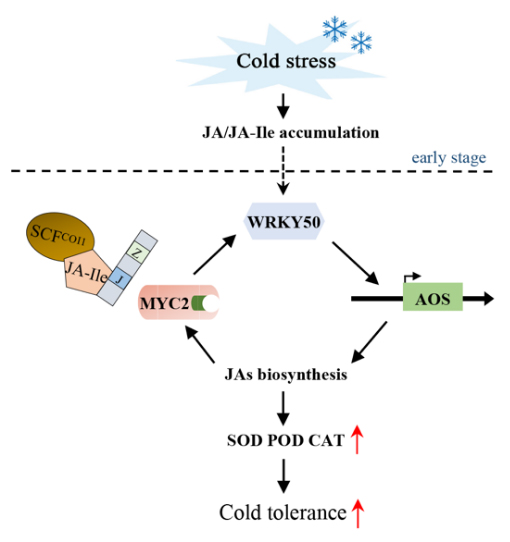 番茄是一种对冷害极为敏感的喜温蔬菜,如何增强番茄植株耐冷性对于冬春季番茄设施栽培具有重要意义。课题组前期发现以野生型多毛番茄作为砧木嫁接栽培番茄能提高其耐冷性,茉莉酸在多毛番茄嫁接增强栽培番茄耐冷性中具有重要作用(研究结果已发表在Horticulture Researchhttps://doi.org/10.1093/hr/uhac227),但其中具体调控茉莉酸生物合成的作用机制尚未明确。