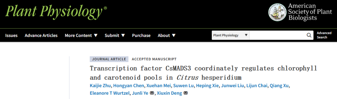 近日,kaiyun开云官方网站/果蔬园艺作物种质创新与利用全国重点实验室邓秀新院士团队在Plant Physiology在线发表了题为“Transcription factor CsMADS3 coordinately regulates chlorophyll and carotenoid pools in Citrushesperidium”的研究论文。该研究鉴定到一个新的MADS-box转录因子CsMADS3,通过协同调控柑橘果实成熟过程中叶绿素降解和类胡萝卜素生物合成,影响果实色泽品质形成,该研究结果为未来通过基因工程手段定向改良柑橘果实色泽品质提供了重要的基因资源。