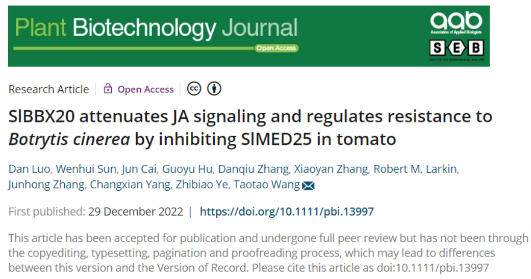 近日,kaiyun开云官方网站番茄团队王涛涛教授课题组在国际权威学术期刊《Plant Biotechnology Journal》发表了题为《SlBBX20 attenuates JA signaling and regulates resistance toBotrytis cinereaby inhibiting SlMED25 in tomato》的研究论文。茉莉酸(JA)在调节植物生长和防御反应中发挥着重要作用,研究发现SlBBX20可调控JA的各种响应反应,是一个新的JA响应的负调控因子,JA与灰霉病的抗性密切相关,当过量表达SlBBX20时,番茄对茉莉酸的响应被抑制,导致番茄对灰霉病的抗性减弱。相反,当敲除SlBBX20基因后,JA响应增强,同时显著增强了番茄对灰霉病的抗性。