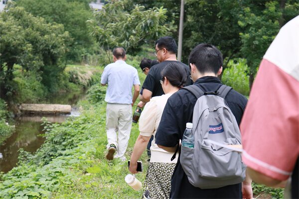 在各党员干部的带领下,刘文平老师以及实践团队在村内开展了实地调研。队员们结合自己的专业知识对村内的建筑立面设计、环境整治以及公共基础设施的建设进行了分析。队员们发现,在被选为“共同缔造”活动试点之前,邱家河村的废弃建筑物,残垣断壁随处可见,村内建筑整体是混乱无序的,垃圾池、公厕、池塘缺少管护,卫生状况较差。基础设施建设也难以满足村民需求,道路上乱堆乱放现象突出,交通阻塞。经过改造后,邱家河村焕然一新,建筑立面经过粉刷后风格统一,保留着原有的荆楚风格,废弃建筑物已拆除,村内建筑规划井然有序。如今,人畜饮水设施,村中广场,路灯等公共基础设施已建设完毕,党员服务中心,道路翻新,垃圾中转站,小公园等项目正在大力建设。靠近池塘时,队员们的视线被池塘中的“小喷泉”所吸引,党员干部介绍到,水体治理也是邱家河村乡貌改善中的一个重要环节。池中的“小喷泉”是水质净化装置,可以对池塘内的水质进行长期的改善。通过多项改造活动后村民的生活环境不断改善,生活幸福感大大提升。