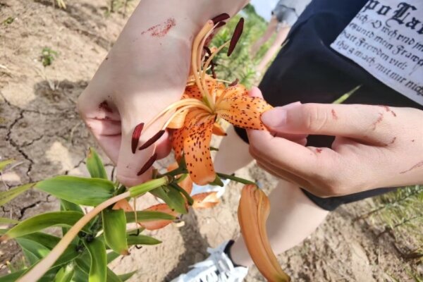 百合标准化栽培技术集成示范基地陈列着药食同源百合“卷丹”、食用百合“龙牙”与观赏百合等。食用百合的鳞茎可食,盛烈的花朵则是与其竞争养分的对手,为保证鳞茎的茁壮生长,在必要时摘去花朵显得尤为重要,于是实践团的成员们在负责人黄总的引导下进入了百合花田参与劳作。花落成泥,含蕴着下一次的盛开与灿烂。随着一朵朵鲜花的落下,实践成员们的手上也沾上了红褐色的花药粉末,如铁屑,如血迹,也是勋章。