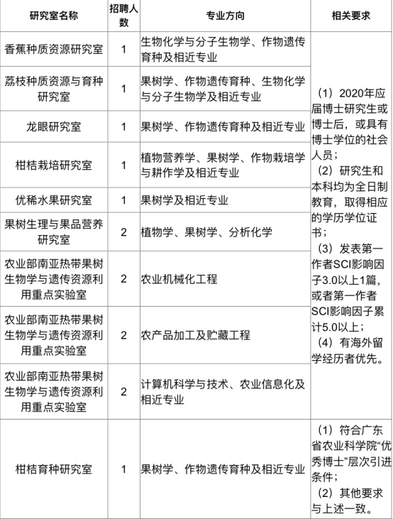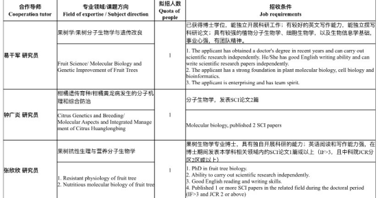 (本次招聘包括2020年第一批公开招聘博士和高级职称人员,以及博士后工作站招收博士后,热忱欢迎有志从事果树科研的应届、往届博士毕业生来所工作或从事博士后工作!)