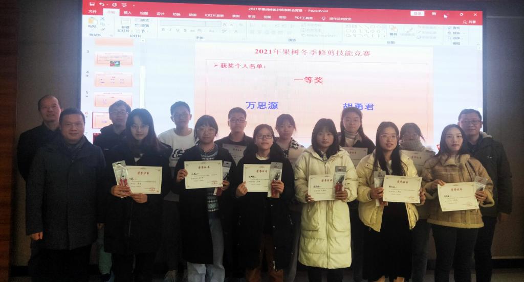 12月30日上午,2021年度果树冬季修剪实习汇报暨表彰大会顺利举行。10个小组轮番上场,用制作精美的PPT、动人声色的视频、生动形象的讲解获得了了阵阵掌声,充分体现了果树修剪实习15天的所学所思所感,同时也展现了现代大学生的良好精神风貌——有的小组利用航拍技术上演了另一个角度的花果山胜景;有的小组用一曲《孤勇者》改编阐释了什么叫做“谁说木屑满身的不算英雄”;有的小组用大家喜闻乐见的《爱情公寓》片头呈现了别样的修剪风采;有的小组则选择用之前爆火的《Coincidance》另类演绎修剪故事……