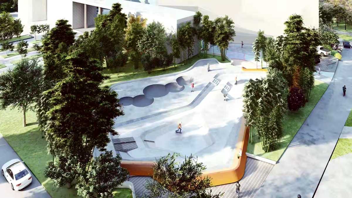 与“动感地带”相邻的区域,将建造一处室外“U形池”轮滑场,多个弧形下沉赛道可以满足轮滑爱好者们对于小尺度、小节奏的轮滑练习需要,同时场地内也会有不同长度、宽度的下沉滑行道路,让爱好者们可以进行多种技法的练习。在安全性上,轮滑场将与地形结合,以交接处的高差来保证观看者的安全。据设计团队张斌老师说,“计划建造这样一个场地,就是要让这里更活跃、更青春。”