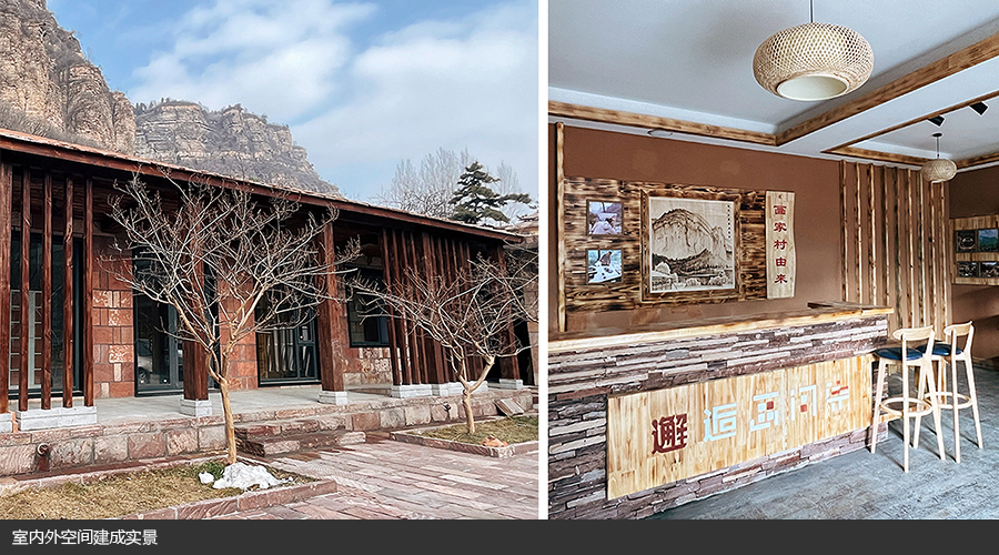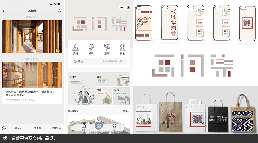 设计团队在升级空间品质、提升空间功能的基础上,期望将当地非遗文化遗产再设计、市场化并融入到日常生活中,期望依托实体空间的创新推动特色活动与线上运营的平台搭建。设计改造从写生艺术出发,挖掘高家台“画家村”背后的文化内涵,提取当地剪纸、根雕、藤编、烙画等传统工艺技术与本土石板岩材质与肌理,置入空间结构营造与家具装饰设计,结合现代空间设计手法与材料,打造一个功能复合型的公共空间“画间集”。同时对其后期运营进行详细的商业计划,提出公众号、小程序的开发与文创周边的体验与售卖等方式,促进空间活化。
