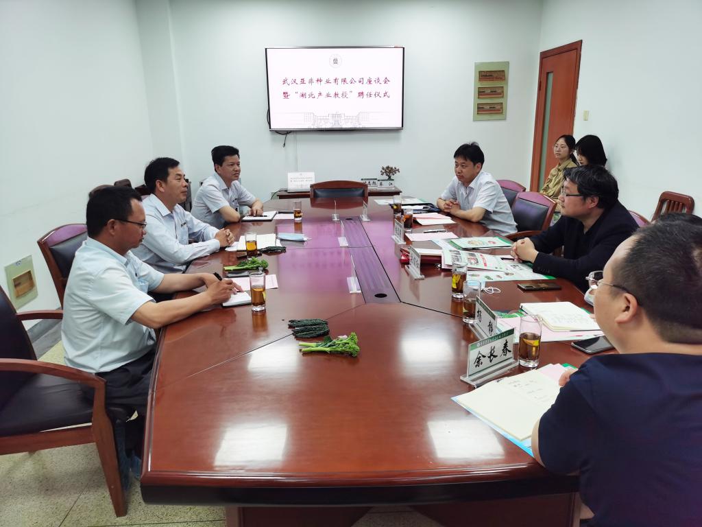 5月5日下午,学院在园林北楼215会议室举行武汉亚非种业有限公司座谈会暨“湖北产业教授”聘任仪式,武汉亚非种业有限公司总经理贺亚菲、副总经理刘传友、农业科技园经理廖建桥、学院党委书记张宏荣、党委副书记蔡江、蔬菜系主任张俊红、教授万正杰及部分蔬菜系老师参加座谈,会议由张俊红主持。