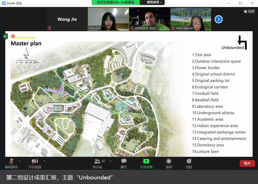 2022年5月27日,“2022中美埃联合设计工作坊课程”课程答辩在线上顺利开展。本课程面向2021级风景园林学研究生授课,教师团队为邵继中、王玏、张炜和章莉。答辩邀请到美国克莱姆森大学Hala Fouad Nassar教授,CU-ICAR副总监Mike Davis先生和Laura Stoner女士,以及埃及艾因沙姆森大学Yasser Mansour教授、Ayman Farid副教授与Ahmed Khaled副教授等六位嘉宾,与风景园林系师生共同进行交流探讨,开展产学研深度融合的国际联合设计课程评图。