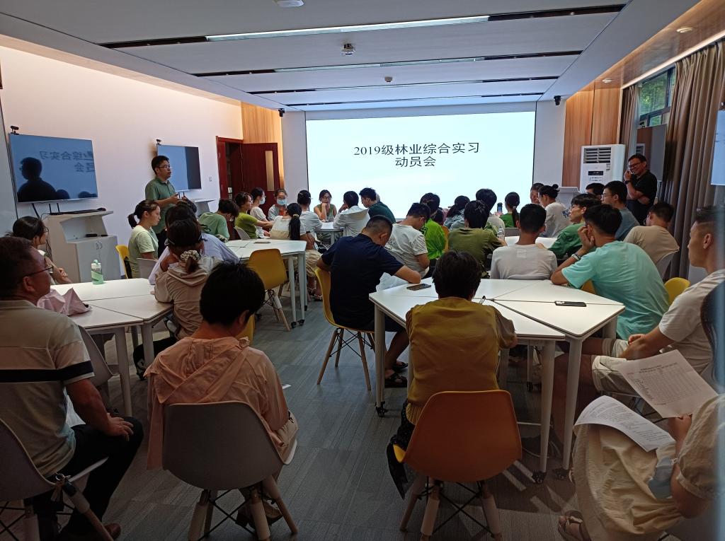 在实习出发前,林学系于8月13日下午召开了综合实习动员会,学院党委副书记蔡江、副院长周继荣出席会议。此次综合实习,主要围绕林业产业特点、林分生长、立地质量评估与建模、抚育采伐设计、造林规划设计、苗圃规划设计和种子园规划设计等方面开展教学实习。