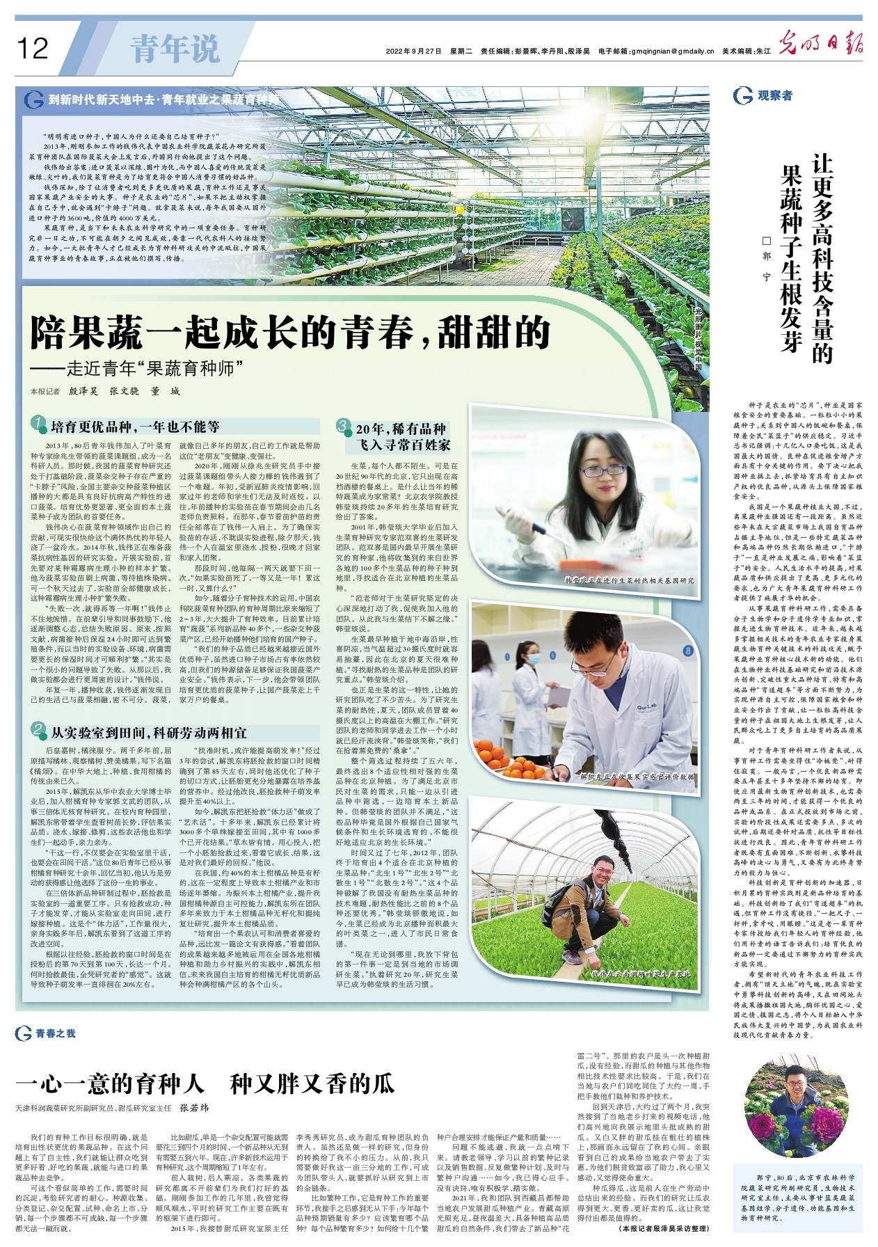 果蔬育种,是当下和未来农业科学研究中的一项重要任务。育种研究非一日之功,不可能在朝夕之间见成效,要靠一代代农科人的接续努力。如今,一大批青年人才已经成长为育种科研攻关的中流砥柱,中国果蔬育种事业的青春故事,正在被他们撰写、传播。
