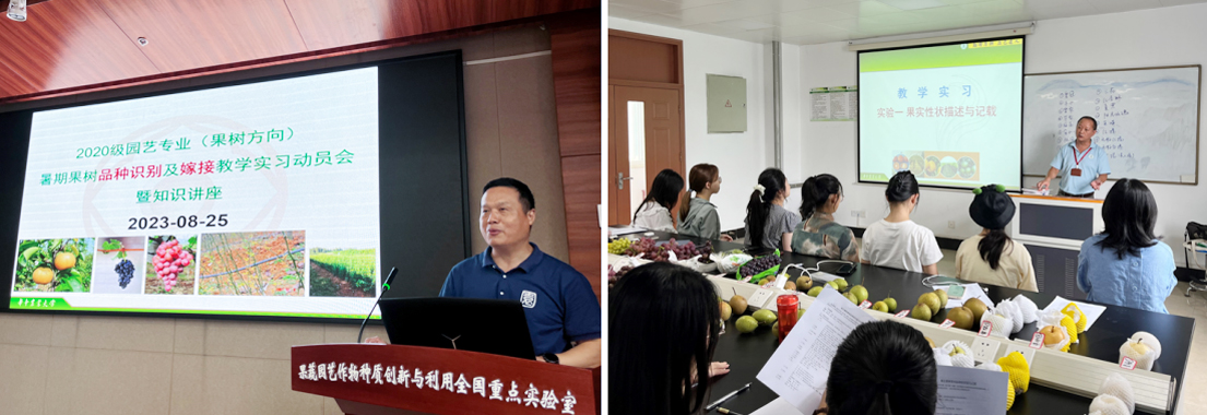 8月25日上午8点半,2020级园艺专业(果树方向)暑期果树品种识别及嫁接教学实习动员大会在园林南楼204报告厅召开,副院长周继荣莅临指导,实习指导教师张青林、解凯东、郭大勇和方燕妮以及41名同学共同参与。周继荣副院长指出虽然本次嫁接实习充满挑战,但华农学子更需练就“吃苦不苦”的本领。张青林老师向同学们详细介绍了本次暑期实习活动安排及果树嫁接理论知识。当天下午在脱毒楼开展了有关梨和葡萄品种性状描述和识别试验。