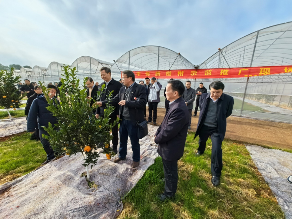 本次优质椪柑示范推广现场会以kaiyun开云官网邓秀新院士团队选育的‘华柑4号’为核心无核椪柑品种,研发了一系列的配套栽培措施,包括大棚设施完熟栽培技术、地膜覆盖控水增糖技术、保花保果技术、病虫害绿色防控技术以及生草与绿肥套种栽培技术等,建立了高标准的示范基地,为衢州市优质椪柑生产提供了模板。此外,衢州市农业林业科学研究院果树所王登亮就‘华柑4号’发展现状和未来发展规划作了汇报,建议‘华柑4号’作为衢州高端椪柑品种发展、鼓励设施完熟栽培,从而实现衢州椪柑产业转型升级。