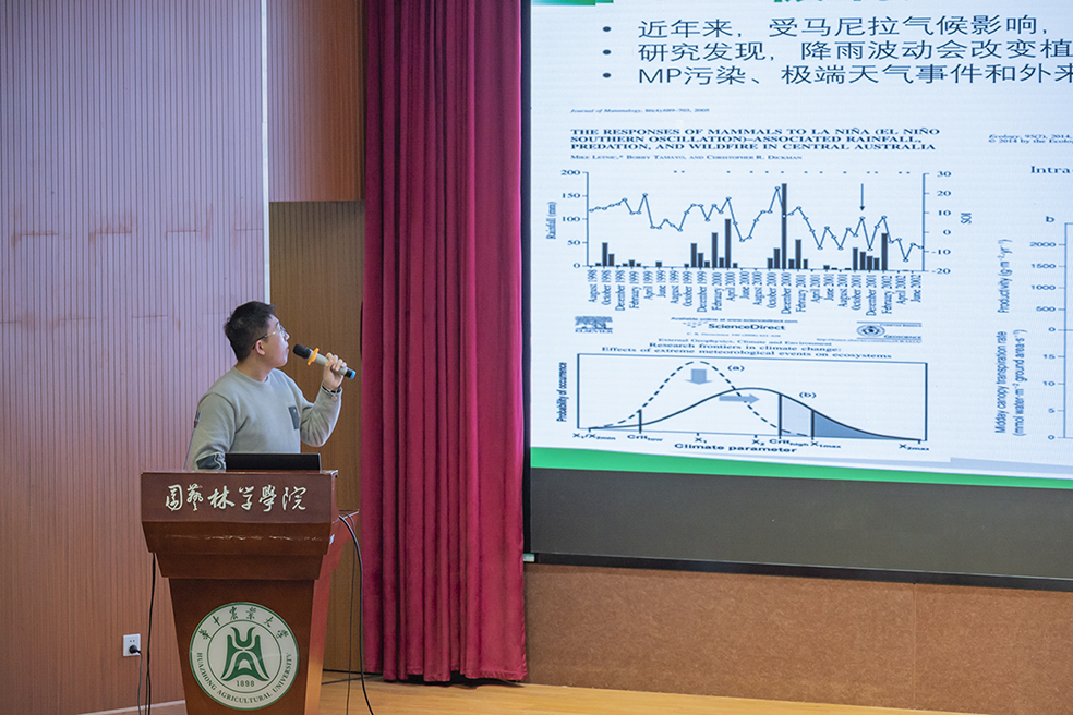 为营造开放、共享、合作、互动的学术氛围、提高研究生综合素质与促进学术交流的发展,2023年12月23日,由林学系研究生自发组织的2023年度林学系研究生学术年会在园林北楼228报告厅顺利举办。学院副院长张斌教授、副院长王鹏程教授到会,参会老师有汪念、王慧、丁寄花、佃袁勇、王滑、滕明君、张瑜等。本场学术年会共邀请17位报告人,其中包含2个特邀嘉宾。年会由汪念老师、研究生王秀媛担任主持人。