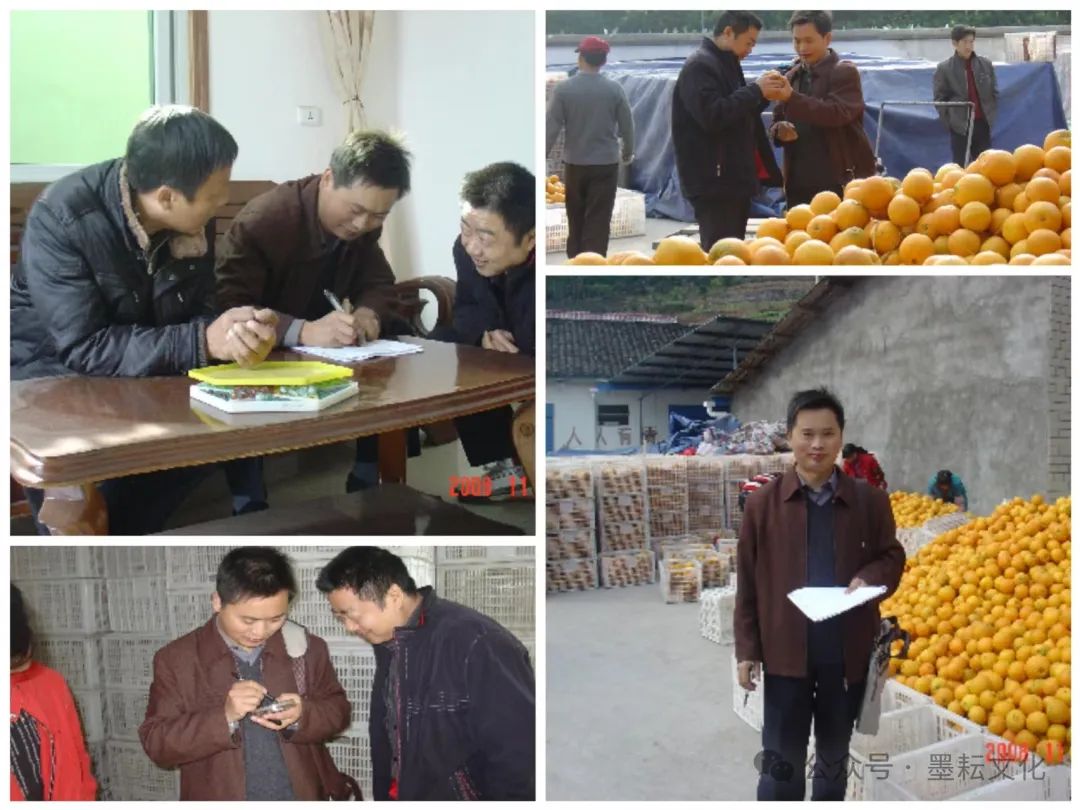 我也多次到水田坝参加柑橘留树保鲜的课题试验和取样工作,我们团队有一张很经典的红肉脐橙“花果同树”的老照片,是我和秦长平到水田坝取样时拍的,现在回想起来已是快20年前的事了。对“留树保鲜”技术,邓老师布了好些点——一项科学研究总是需要布很多点来观察。所以那次我们还坐轮渡到了郭家坝对岸的邓家坡村何明国家里,他是村党总支书记,也是我们的科技示范户,他思想开明,对科技示范很用心,尤其是对技术示范的现场和相关的数据保留得很好,让人印象深刻。第一手数据至关重要,这是秭归橘农对我们科研工作最实在的支持。