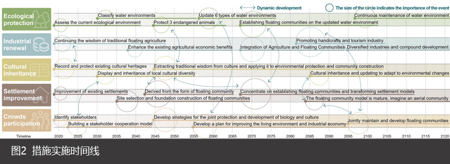 2024-2075年,构建孟加拉国政府、国际组织、当地企业、社会组织以及当地居民多方参与的框架。同时聚焦于水环境提升、生物保护、传统农业与人居环境建设,主要对区域内六种水环境功能区:红树林、种植园、农田、聚落、湿地和河流,实施具体的保护和改善措施,将“漂浮农业”的传统文化融入自然与人居环境的提升中,为未来形成“漂浮城市”奠定重要基础。