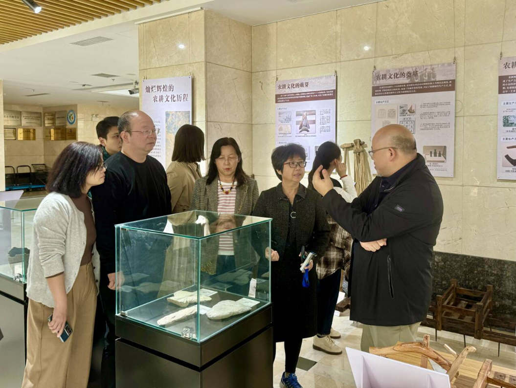 10月24日上午,风景园林系教工党支部和研究生党支部党员代表在第三综合楼一楼大厅参观学习“中华农耕文化展”,切实领会习近平总书记关于传承发展提升农耕文明、建设农业强国重要论述的内容。农业历史研究中心主任柏芸教授结合农耕工具实物详细介绍了农耕文化萌芽、奠基、雏形、形成和拓展等发展阶段的基本特点、古代先民发明的间作模式、立体种养、稻鱼共生、基塘系统等农业生态模式、以及因地制宜、用地养地、治田勤谨、先令其器、集约经营、量力而行、不违农时等农学思想。