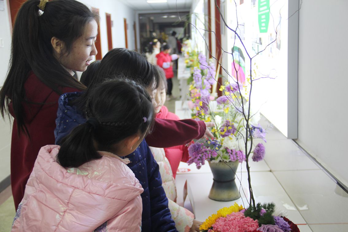 楼道里插花艺术作品分为指定主题“诗意颂中华”以及指定类型展,共50件作品整齐排列在学院二楼大厅及楼道里。小朋友们看到花卉及园林植物种类多,颜色搭配好看,与身边的同学逐一探讨插花作品,不时拍个照片,觉得每个作品名称富有诗意文化气息。尤其与花卉搭配的小动物们与作品形成完美结合,小朋友们流连忘返,不时发出惊叹。