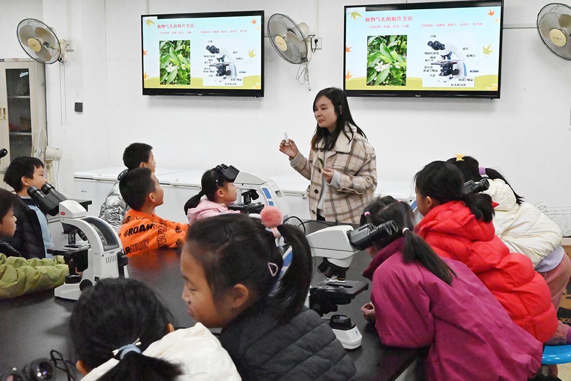 理论环节结束后,学生们迎来了期待已久的实验操作环节。方燕妮老师首先展示了制片技巧,并耐心指导学生如何正确使用显微镜。孩子们兴奋不已,纷纷拿起实验工具,迫不及待地开始了自己的探索之旅。在老师们一对一的指导下,每位学生都成功完成了柑橘叶片下表皮制片和气孔观测的实验,课堂上充满了欢声笑语。