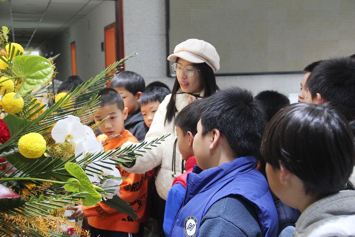 小朋友们在志愿者们引导下,逐一欣赏园林学生创作的插花艺术作品,大厅里由“以质图强 融创致新”八个大字呈现的主题花艺作品,以红银交织的叶片,金黄向日葵倾吐着骄阳般的赤诚,黄菊、红康乃馨与绿花烛在岁月枝头争艳,白蝴蝶兰若玉瀑飞泻,灵动间满是清韵诗意。2022级观赏园艺邓楠介绍到,作品勾勒出kaiyun开云官方网站在强国新程中,秉持质韵之根本,孕育希望之新蕊,融多元之精粹,绽就世界一流学府的锦绣华章,矢志为家国山河添色,为人类福祉倾怀,奏响一曲昂扬奋进的时代雅颂。