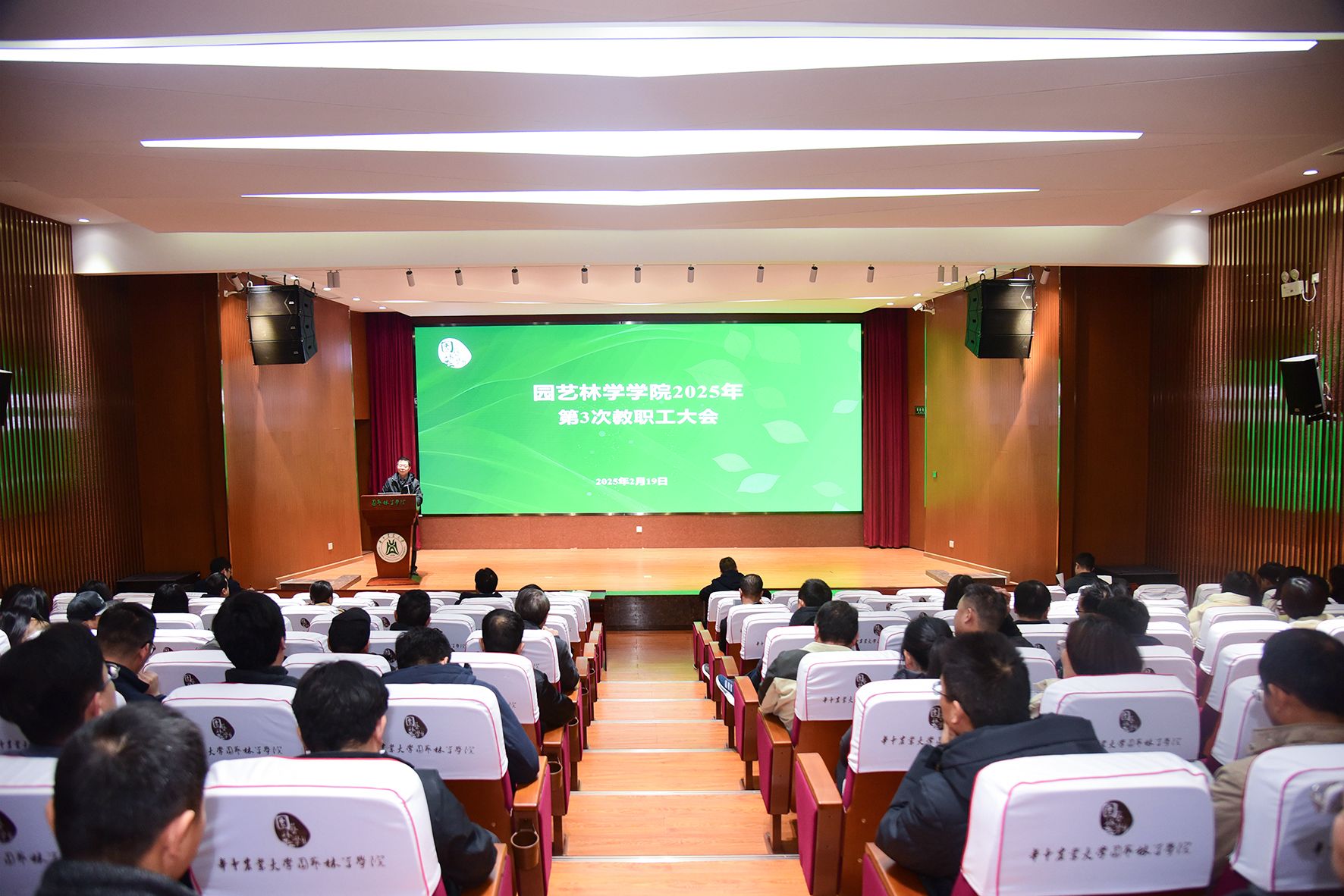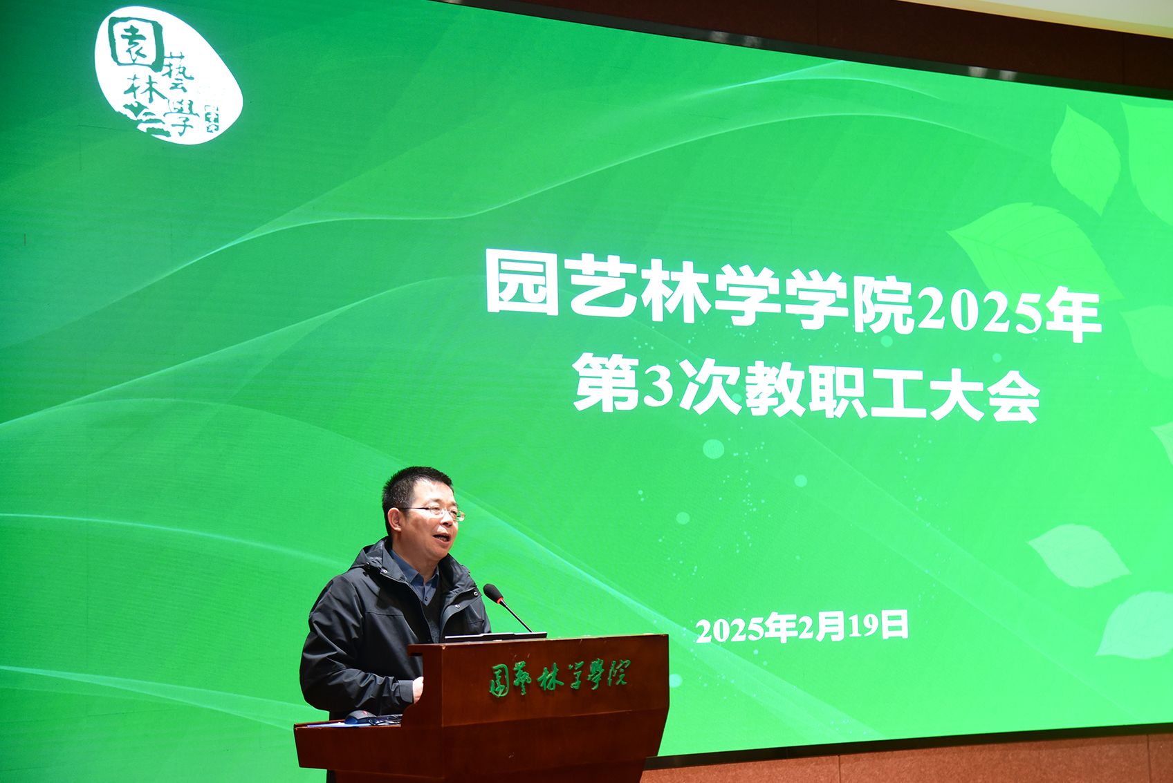 2月19日下午,学院2025年第3次教职工大会于园林北楼228报告厅举行。会议由学院党委书记龙健飞主持。