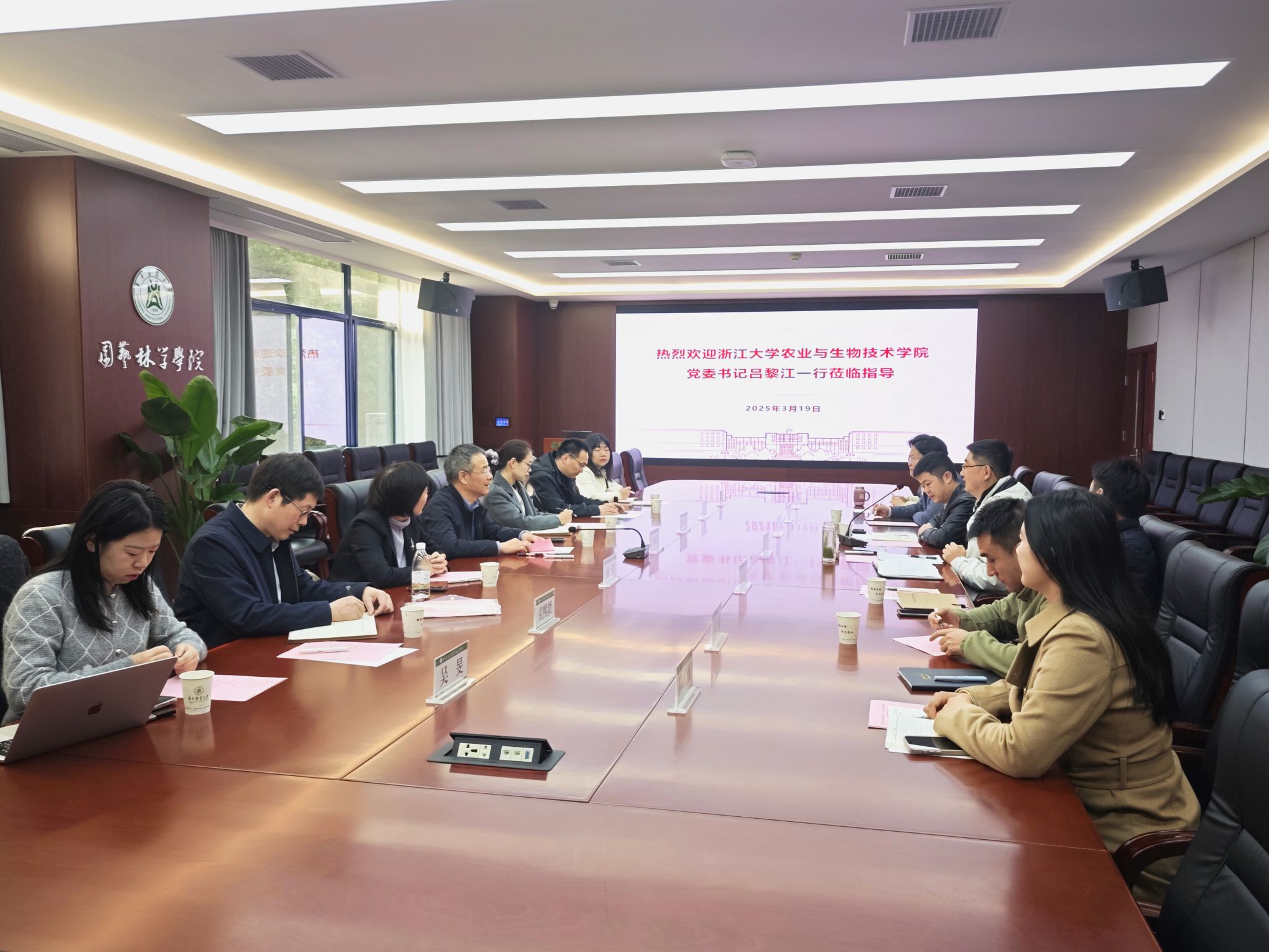 3月19日上午,浙江大学农业与生物技术学院党委书记吕黎江一行7人来院调研交流,学院党委书记龙健飞、党委副书记林辉和果蔬园艺作物种质创新与利用全国重点实验室副主任卢刚以及相关辅导员热情接待了吕黎江一行并开展座谈交流。