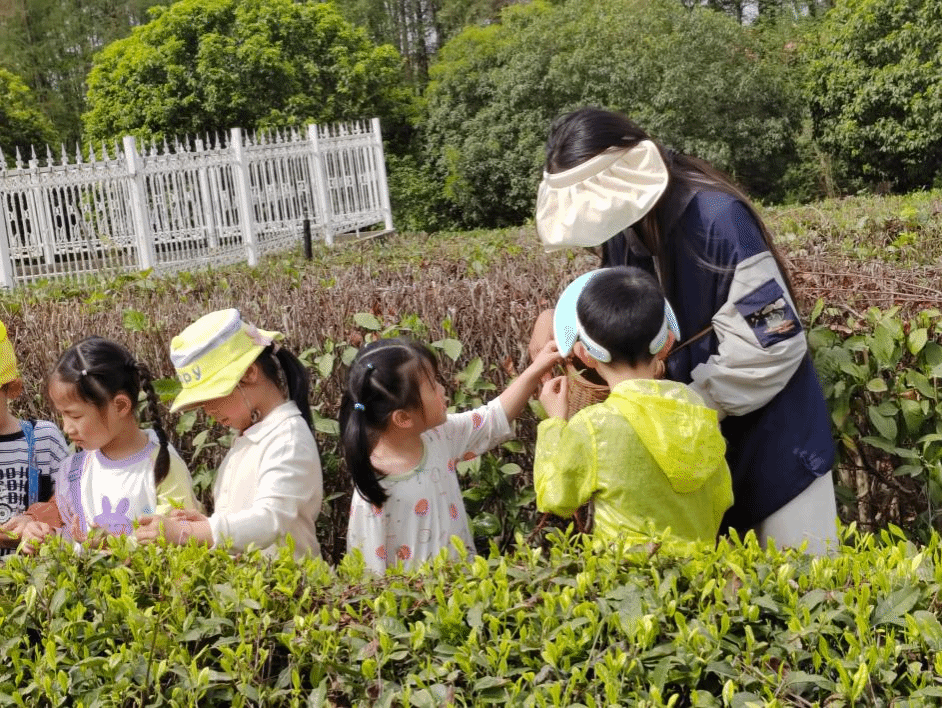 最后,全体师生共同前往南湖茶园开展实践环节。茶学专业学生首先示范黄金芽“一芽一叶”、“一芽二叶”、“一芽三叶”的采摘标准,随后指导小朋友们佩戴小茶篓,化身“小小茶农”亲手体验采摘。蓝天碧野间,孩子们小心翼翼挑选嫩芽,不时与同伴分享收获,欢笑声与茶香交织成春日画卷。