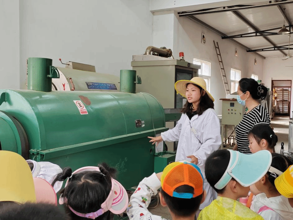 活动首站,小朋友们走进茶学茶厂。在茶学学生的引导下,孩子们近距离观察杀青锅、滚筒杀青机、揉捻机与烘干机等制茶设备,通过趣味讲解了解茶叶从鲜叶到成品的加工流程。