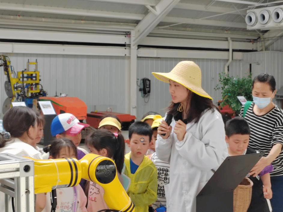 随后,团队转场至农业机房。面对智能化采茶机、辅助作业人机协作机器人系统等现代农业机械,茶学学子结合动态演示,生动阐述科技如何赋能传统茶产业,孩子们在惊叹声中初步建立起“智慧农业”的认知框架。