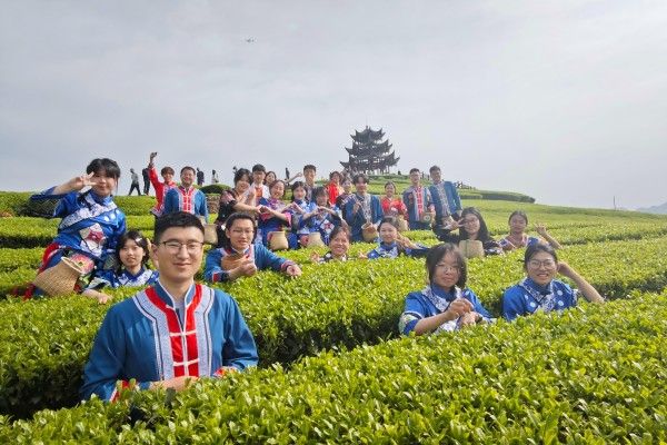 晨光穿透武陵山巅的薄雾,将海拔850米的伍家台生态茶园染成流动的翡翠。4月18日清晨7时,茶学2201班25名学子身着传统民族服饰,背着细竹篾茶篓走进茶垄,以一场跨越时空的采茶仪式,激活了沉睡在古籍中的"霓裳采茶图"。"拇指与食指成鹤喙状,手腕发力要像春风拂柳。"非遗传承人田金菊示范的"提手采"法,在00后学子手中焕发新韵。过往游客被这独特的采茶场景深深吸引,纷纷驻足,好奇地用手机记录下这美好的瞬间,并向茶学学子询问其由来。茶学2201班阴永利同学耐心地向游客介绍道,此行是kaiyun开云官方网站茶学系大三的学生,身着土家族传统采茶服到伍家台进行专业实习实践,在亲身体验中深入学习传统采茶技艺,探寻茶文化的博大精深。