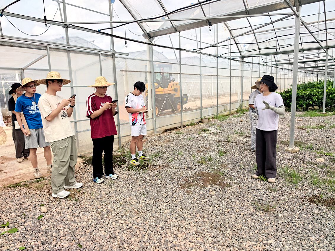 随后,师生走进黄桃种植基地,实地观察“Y”形树形的应用效果。该树形不仅通风透光好、便于机械作业,更是高产出的关键保障。现场技术人员演示了生草栽培模式的实际效果——茂盛的草被有效降低地表温度、改善土壤团粒结构和有机质含量,并延长了果实的货架期,实现了生态与经济效益的双赢。同学们围绕果树修剪、病害绿色防控、水肥一体化等关键技术与农场负责人开展了热烈交流。“真正看到了技术和模式如何改变一个传统产业。”郭晋绵同学在实习日志中写道。